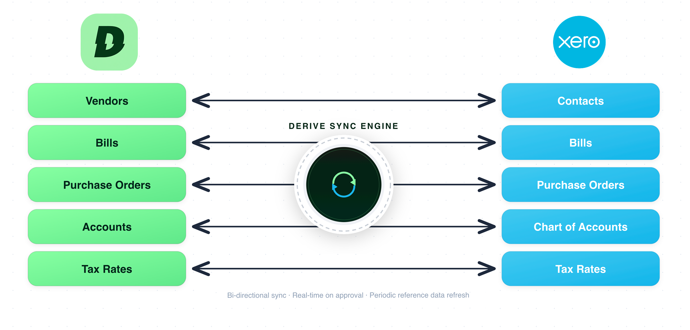 - Bills created in Derive flow to Xero after approval. Bills created directly in Xero are not routed through Derive approvals.